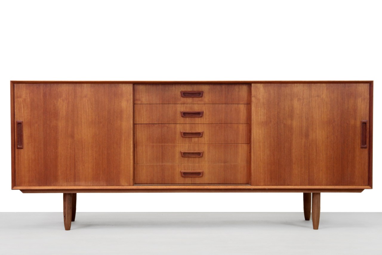 Omschrijving: Erg mooi en groot Deens design dressoir. Gemaakt van teak fineer en massief teak hout. Dit sideboard heeft twee schuifdeuren en vier lades. Achter de linkerdeur is een plank en een gaatje in de achterwand voor snoeren. Achter de rechterdeur zitten twee planken. Het dressoir is van degelijke Deense kwaliteit. Het dressoir is 199 cm breed, 45 cm diep en heeft een hoogte van 84 cm.