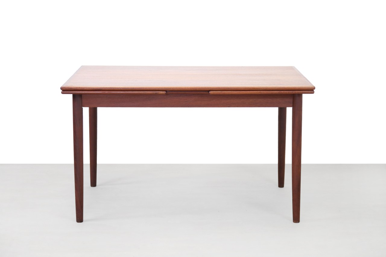 Omschrijving: Vintage Deense uitschuifbare eetkamertafel uitgevoerd in teakhout. De extra bladen zijn mooi geïntegreerd in het ontwerp opgeborgen onder het blad. De tafelbladen zijn mooi afgerond met massief teak houten randen. Deze tafel is 130 cm lang, 86 cm diep en 75 cm hoog. Helemaal verlengd is de tafel 218 cm. Eenmaal verlengd is de tafel 174 cm