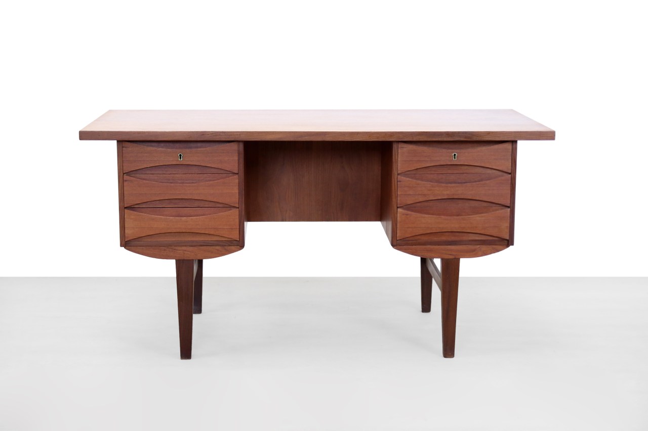 Omschrijving: Stijlvol Deens design bureau gemaakt van teakhout. Dit bureau is multifunctioneel en heeft een prachtige vormgeving. Slanke toelopende pootjes, 6 lades met een vormgeving die ons doen denken aan ontwerpen van Arne Vodder, en een teak gefineerd blad. Aan de achterkant van het bureau zijn nog drie vakken te vinden, om bijvoorbeeld boeken of verzamelingen op te bergen. Hij kan daardoor ook heel goed midden in de ruimte geplaatst worden. Een bureau en opbergmeubel in een. Het bureau is 150 cm breed, 77 cm hoog en 70 cm diep.