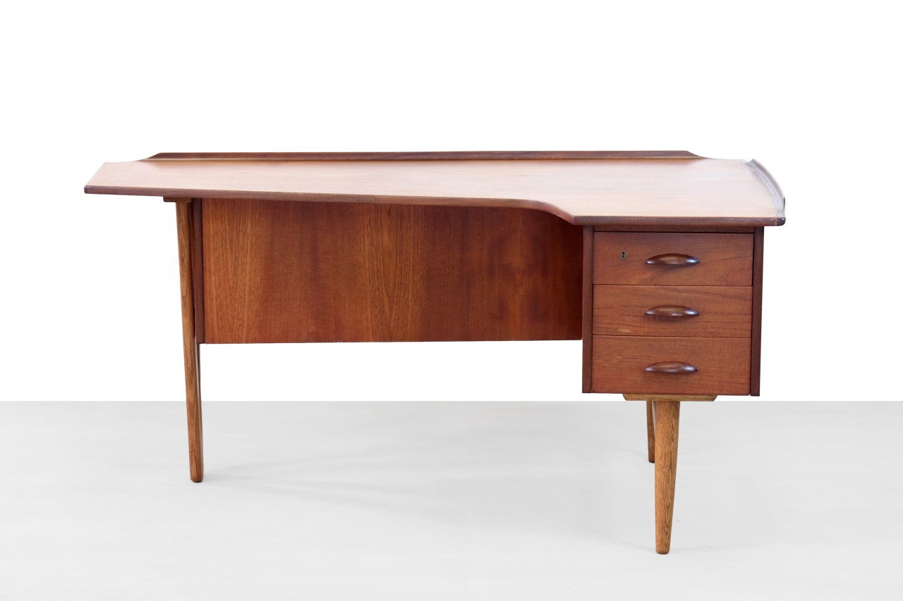 Omschrijving: Erg mooi Boomerang bureau van Peter Lovig Nielsen voor Hedensted Møbelfabrik. Gemaakt van teakfineer, massief teak en massief eiken. Prachtig ontwerp met bijzondere details. Deze versie met V-poot in eiken zie je niet vaak. Het bureau heeft drie lades aan de voorkant, een groot vak voor boeken aan de achterkant en extra opbergruimte aan de achterkant die af te sluiten is door middel van een klep. Deze desk is van alle kanten een genot voor het oog een staat daardoor ook mooi in het midden van de ruimte. Het bureau is 150 cm lang, 88 cm diep en 72 cm hoog.