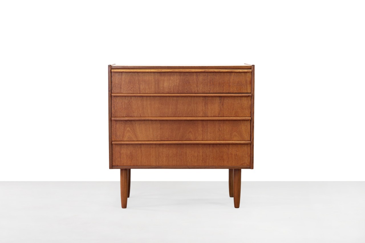Omschrijving: Deens design ladekast met 4 lades. Uitgevoerd in teak. De vormgeving van het kastje is modernistisch, recht en zonder poespas. Dit maakt het kastje een tijdloos model. Fijn formaat die je op meerdere plekken in het huis kwijt kunt en waar je veel in op kunt bergen. Deze ladenkast is 79 cm breed, 40 cm diep en 79 cm hoog.