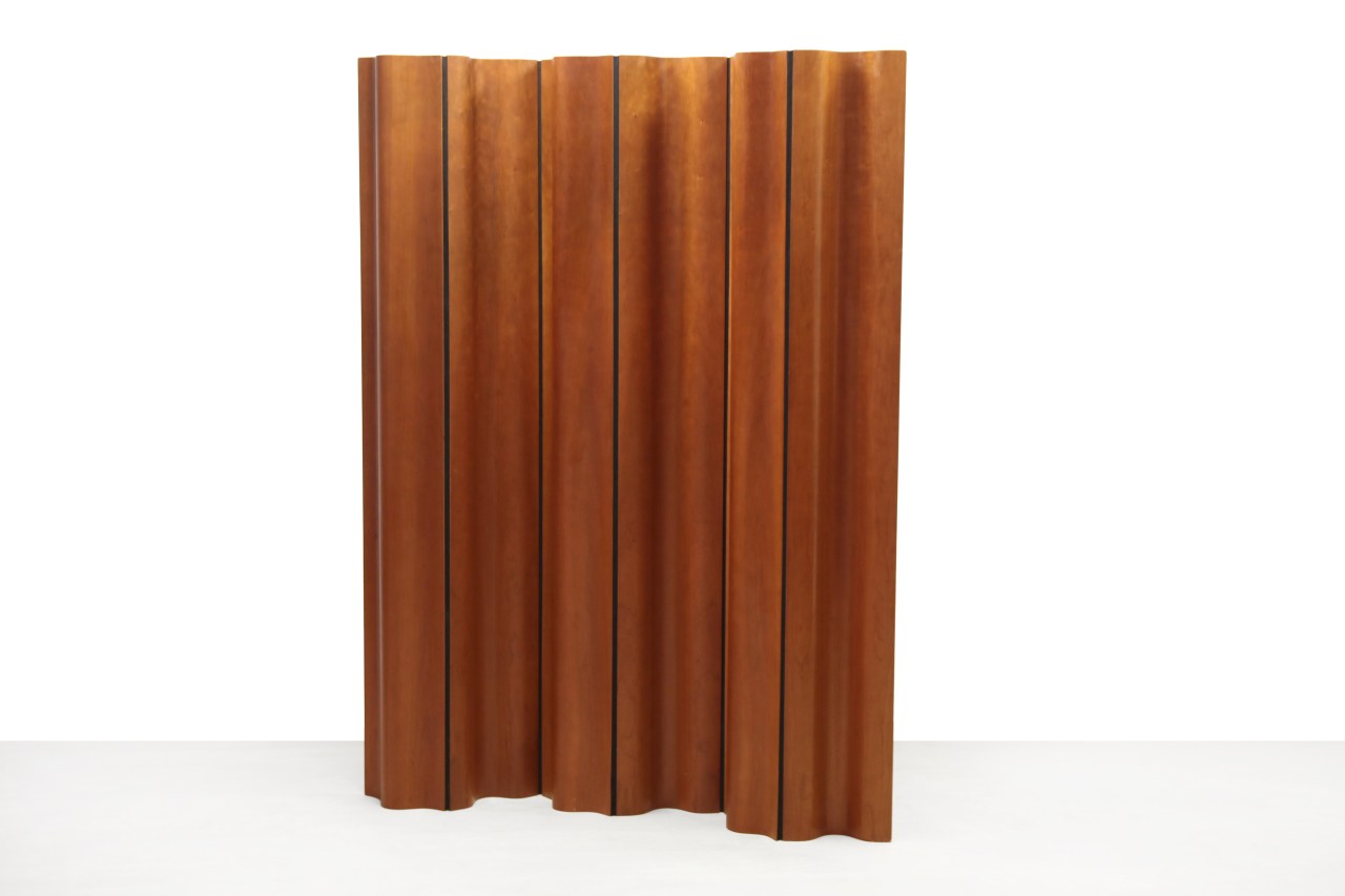 Omschrijving: Zeldzaam vouwbaar kamerscherm ontworpen door Charles en Ray Eames en geproduceerd door Herman Miller. Dit kamerscherm is gemaakt van voorgevormd multiplex met zwarte canvas scharnieren en is makkelijk draagbaar, opvouwbaar en verplaatsbaar. Je kunt het scherm daarom makkelijk in verschillende posities neerzetten om zo eenvoudig een ruimte af te schermen. Het plywood is gemaakt van prachtig gekleurd kersenhout, wat bijna dezelfde uitstraling heeft als Teak. De golvende houten panelen zijn niet alleen functioneel, maar ook een sculpturaal kunstobject op zich.