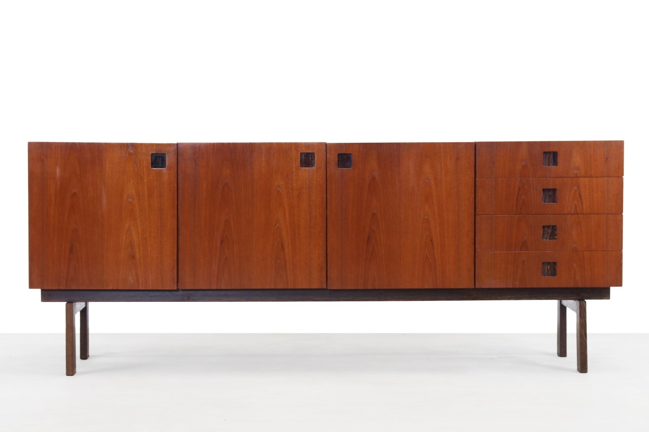 Omschrijving: Dit is een erg mooi en elegant Nederlands design dressoir gemaakt door Hulmefa. Dit dressoir komt uit de Propos serie, gemaakt eind jaren 50-60. Het is gefineerd in teakhout met wengé details, zoals de diepliggende vierkante grepen. Het dressoir rust op een wengé houten onderstel. Het dressoir heeft 4 lades, 3 deuren en 2 legplanken. Dit dressoir lijkt veel op de bekende Japanse serie ontworpen door Cees Braakman voor Pastoe, maar deze kast heeft net wat mooiere details. Zo zijn de scharnieren mooi blind weggewerkt in dit model. Dit dressoir is 201 cm lang, 43 cm diep en 80 cm hoog.