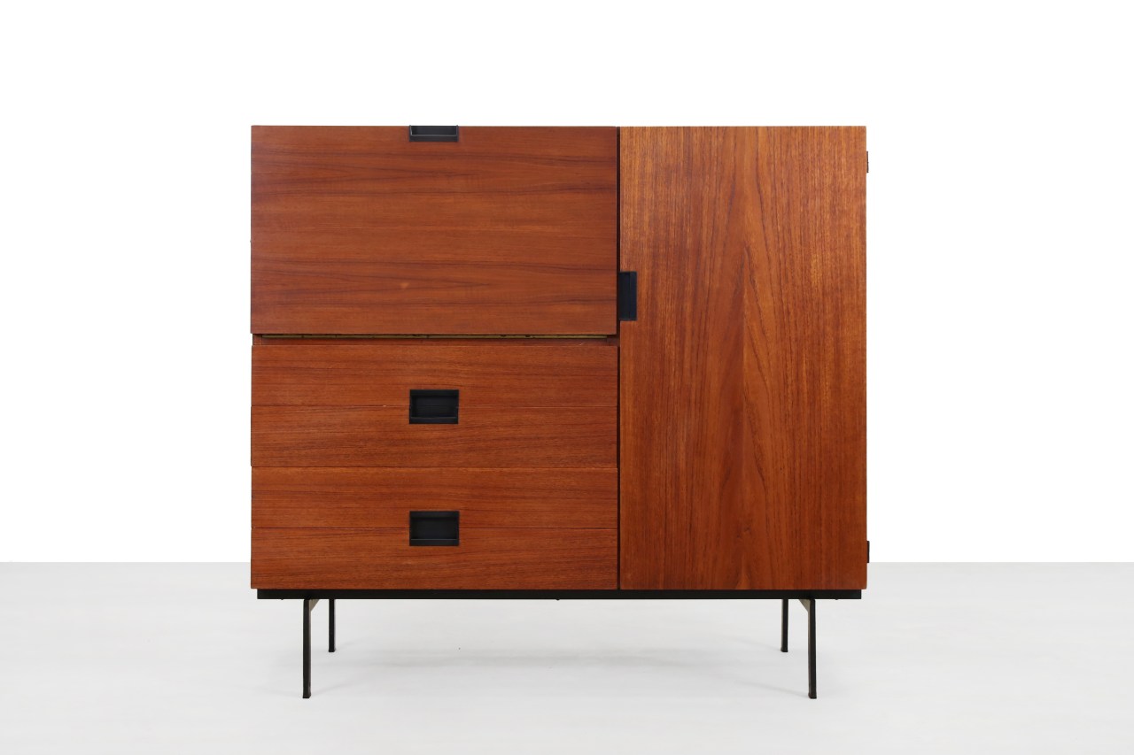 Omschrijving: Zeer mooi cabinet uit de Japanse Serie van Cees Braakman. Deze kast is niet alleen prachtig maar biedt ook veel opbergruimte. De teakhouten kast heeft een prachtige tekening in het hout, en de iconische zwarte handgreepjes. De kast staat op een slank minimalistisch metalen onderstel. Het linker boven deurtje, kan ook als bureau gebruikt worden. De kast is gemerkt. Dit highboard is 126 cm breed, 45 cm diep en 117 cm hoog.