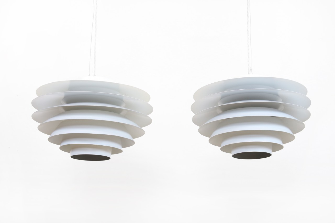 Omschrijving: Prachtige witte Sven Middelboe ‘Verona’ Hanglampen. Het gaat om de grote versie met 7 ringen. Door de grootte van de lamp zijn ze zeer geschikt voor boven een grote eetkamertafel. De lampen geven mooi zacht verspreid licht. Een tijdloze klassieker, welke past in elk interieur. De lampen hebben een diameter van ruim 50 cm.