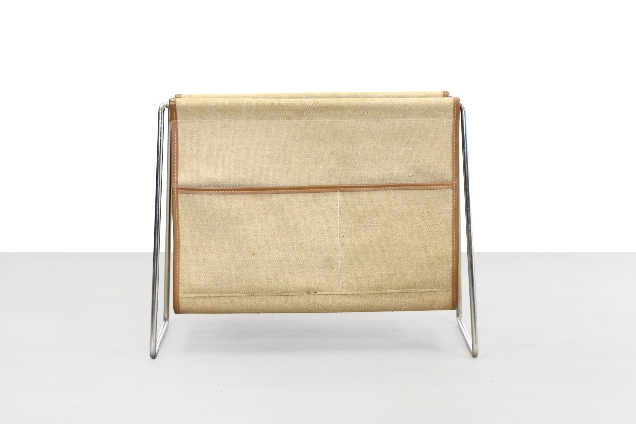 Omschrijving: Mooie canvas tijdschriftenhouder ontworpen door Verner Panton en geproduceerd door Fritz Hansen in Denemarken. Deze magazine houder is gemaakt van gebogen chromen buizen en canvas. Erg minimalistisch en tijdloos ontwerp.