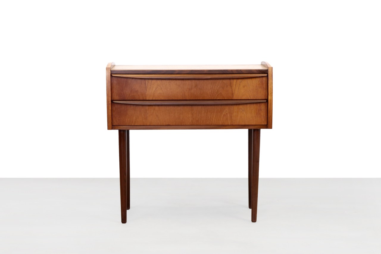 Omschrijving: Deens design ladekast met 2 lades. Uitgevoerd in teak. De vormgeving van het kastje is typisch mid century modern, recht en zonder poespas, met prachtige ronde details in de randen en de greepjes van de lades. Fijn formaat die je op meerdere plekken in het huis kwijt kunt.