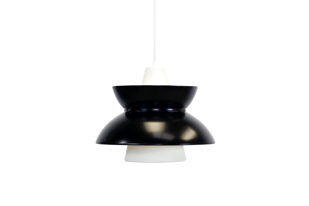 Omschrijving: Prachtige organisch vormgegeven lamp van Jorn Utzon voor Nordisk Solar. Jorn Utzon is wereldberoemd geworden als architect van het operahuis in Sydney. De ‘Søværnspendel’, welke ook vaak Navy lamp wordt genoemd omdat deze lamp in opdracht van de Deense Marine is gemaakt voor hun Marinebasis, is uitgevoerd in zwart wit. Deze lamp is 23 cm hoog en heeft een diameter van 28 cm.