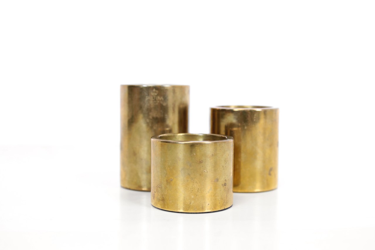 Omschrijving: Zeer mooie messing kandelaartjes ontworpen door Michael Kurpatow. Dit ontwerp wordt Tripp Trapp Trull genoemd en draagt modelnummer 733. De kandelaars zijn zowel geschikt voor kaarsen als voor theelichten door de twee verschillende maten openingen. De kandelaartjes zijn geproduceerd door Skultuna en een van de kandelaren is dan ook gemerkt.
