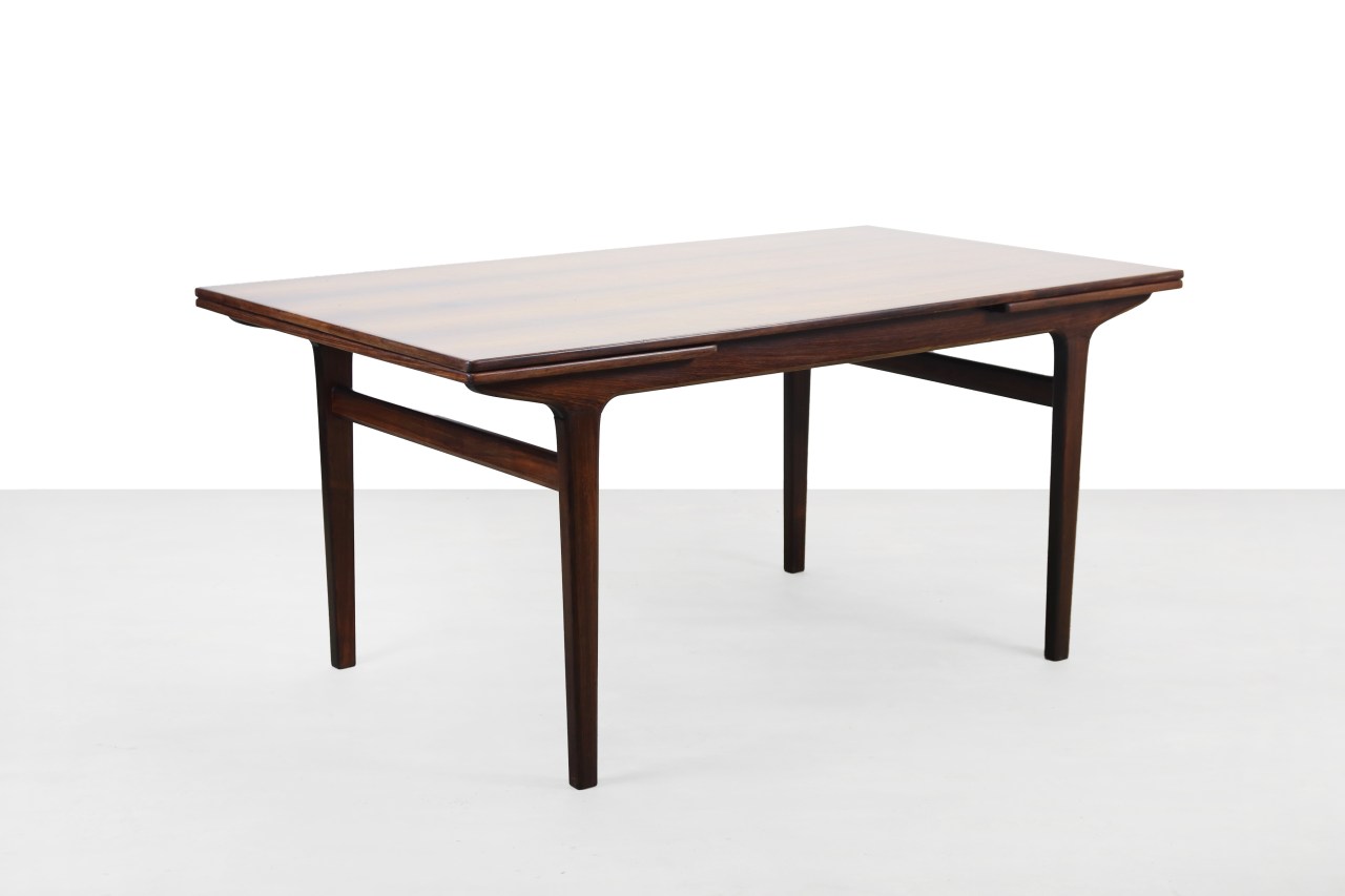 Omschrijving: Mooie grote palissander houten eetkamertafel ontworpen door de Deen Johannes Andersen. De tafel heeft twee extra bladen die stijlvol verwerkt zijn onder het blad en uitschuifbaar zijn zodat er makkelijk 8 tot 10 mensen aan de tafel kunnen zitten. Degelijke Deense kwaliteit en een prachtig organisch ontwerp. Het blad van de tafel is gelakt waardoor de UV in de loop der tijd het blad iets lichter heeft gemaakt. Er is daarom een klein kleurverschil tussen het blad en de extra bladen. Omdat de lak er nog ontzettend mooi op zit en de verkleuring minimaal is, hebben wij het zo gelaten. De tafel is 160 cm breed en met de extra bladen komt er in totaal een meter bij. De tafel is 90 cm diep en 72 cm hoog.
