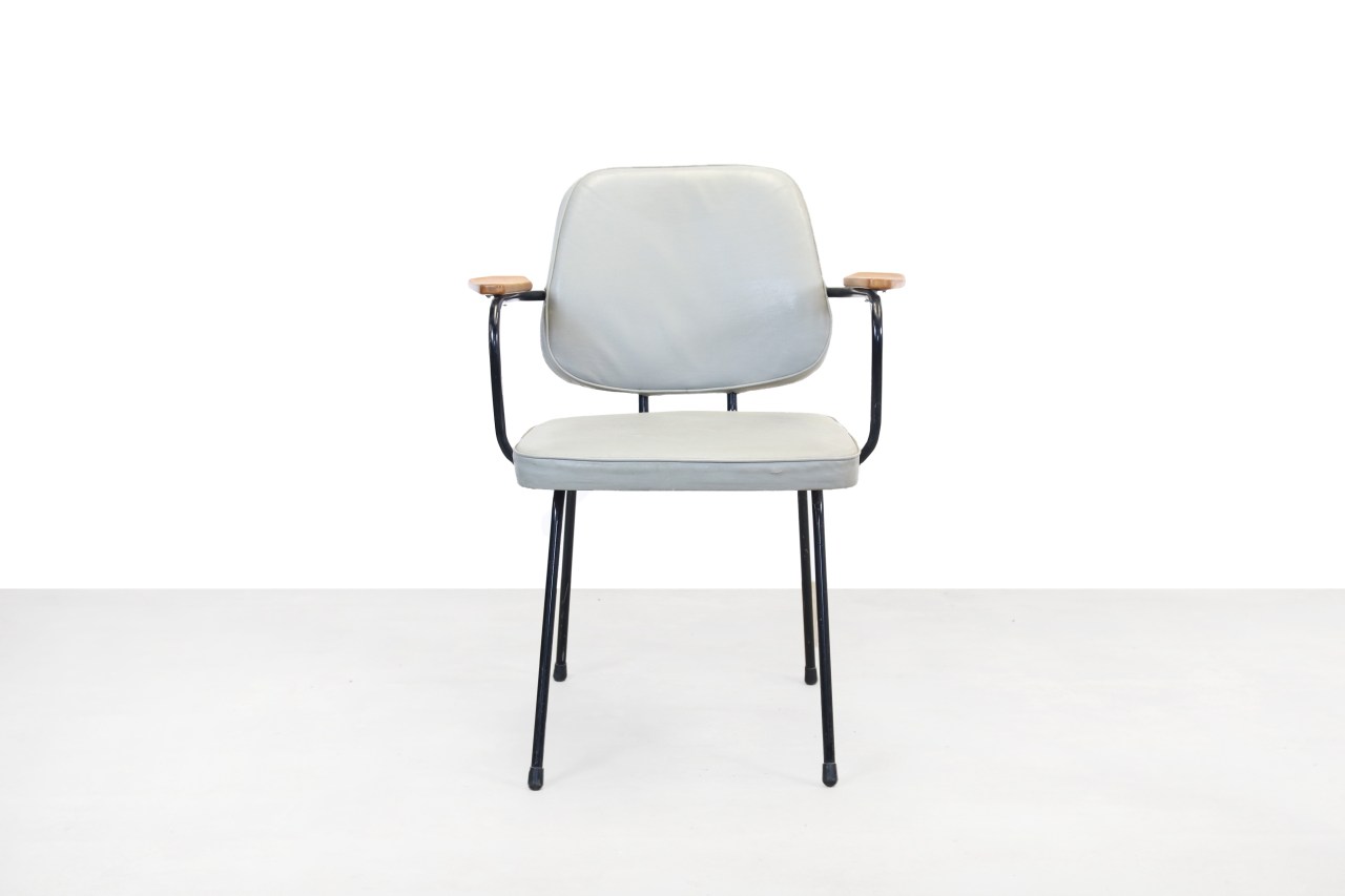 Omschrijving: Prachtige niet veel voorkomende stoel van Cees Braakman voor Pastoe. Uit de catalogus uit 1954 met ontwerpen van Willy van der Meeren en Cees Braakman hebben wij kunnen achterhalen dat dit model FM01 is en ontworpen is door Braakman, met ontzettend veel gelijkenis naar de stoelen van Willy van der Meeren. Prachtig vormgegeven berkenhouten armleuningen op een metalen frame en nog in de originele grijs skai lederen bekleding. Er zit wel een klein haarscheurtje in de zitting, maar omdat dit zo onopvallend is hebben wij de voorkeur aan gegeven om de stof origineel te houden.