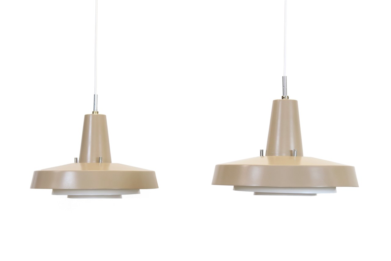 Omschrijving: Prachtige set hanglampen van architecten Eva en Nils Koppel. Deze hanglamp heeft modelnaam Top III en is geproduceerd door bekende lampen fabrikant Lyfa. De lampen hebben een diameter van 32 cm en zijn voorzien van een nieuwe kabel.