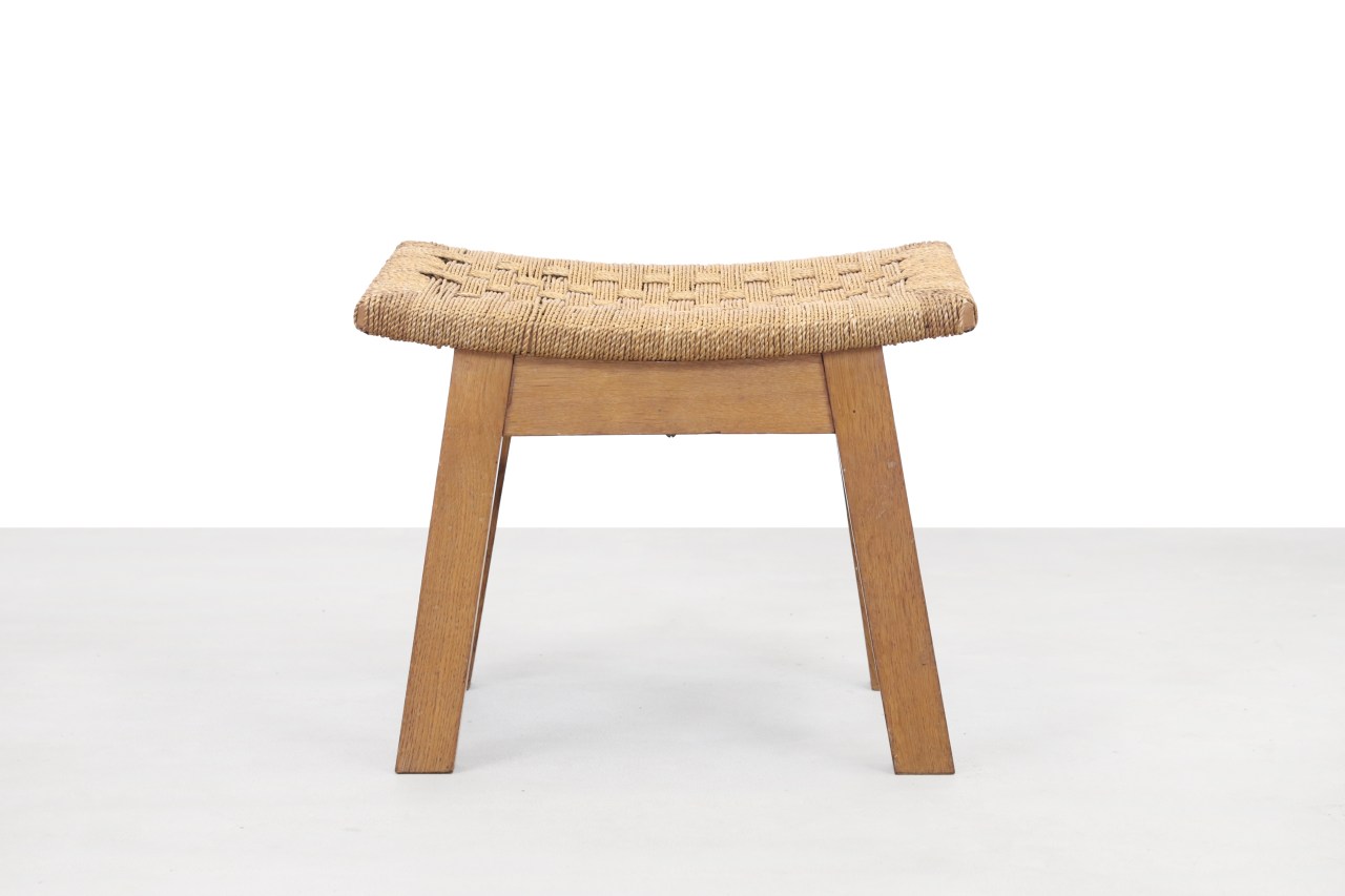 Omschrijving: Vintage eikenhouten shaker style kruk met gevlochten papercord zitting. Gebruik deze kruk eventueel ook als voetenbankje bij de bank of fauteuil.