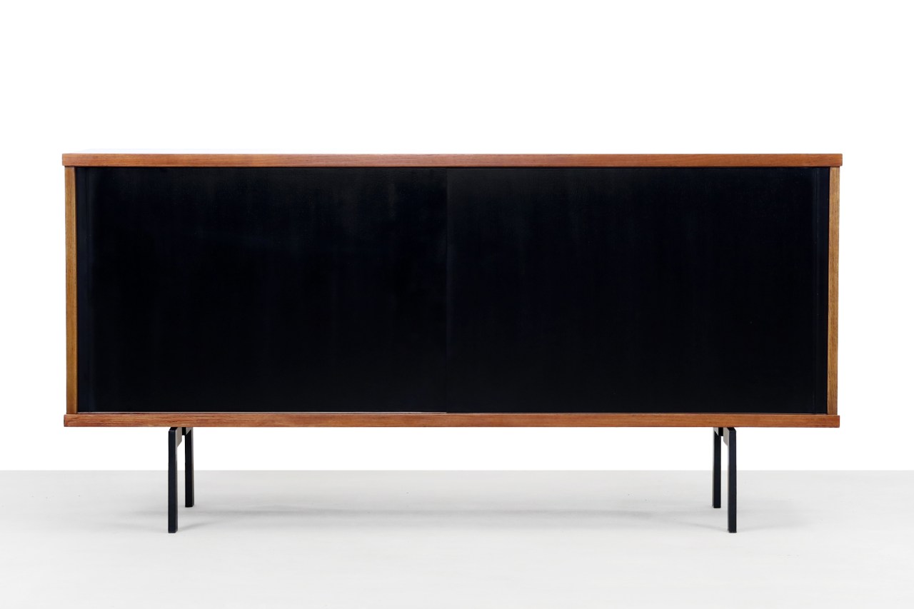 Omschrijving: Mooi Nederlands minimalistisch dressoir uit het begin van de jaren 60 ontworpen door Cees Braakman voor Pastoe. Het dressoir is van teakhout en heeft zwarte schuifdeuren. Dit dressoir komt uit dezelfde U&N serie van Pastoe wat vandaag de dag de Japanse serie wordt genoemd. Het dressoir staat op zwart metalen pootjes. Het dressoir is 150 cm breed, 82,5 cm hoog en 40 cm diep.