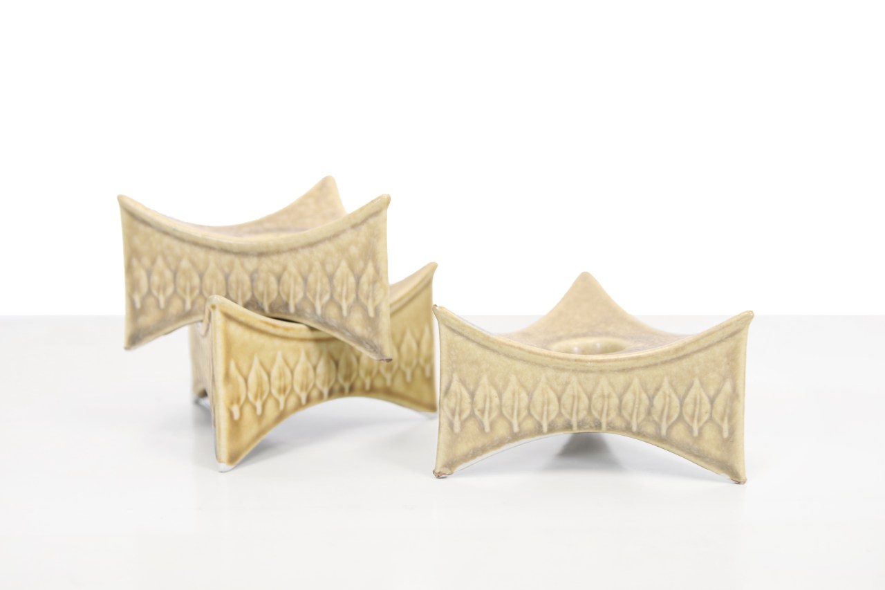 Kenmerken: Drie vintage Deens design kandelaars van Quistgaard. Deze kandelaars komen uit de ‘Relief’ serie gemaakt voor Nissen Kronjyden. Kenmerkend is het mid century modern motief en de okergele kleur.