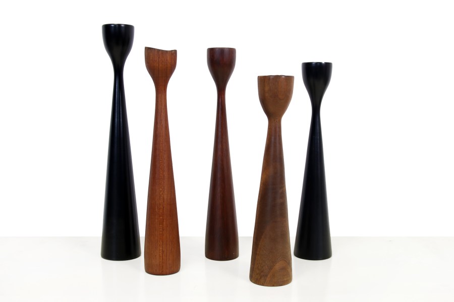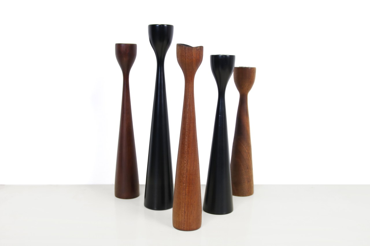 Omschrijving: Zeer mooi vormgegeven kandelaren uit Denemarken. Mooi in een groepje van een paar kandelaren bij elkaar. Uitgevoerd in Teak hout en zwart gelakt hout. Zelfs zonder kaars al een mooi object voor thuis.