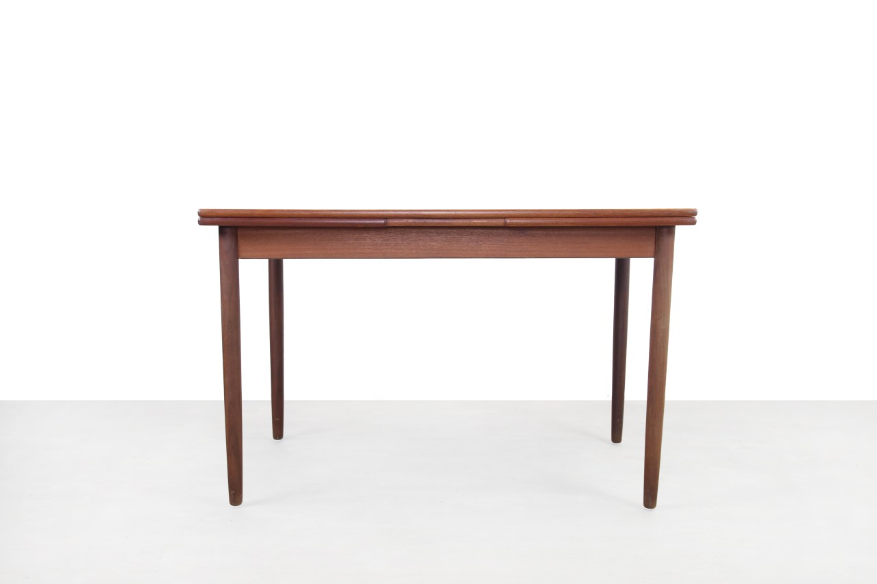 Omschrijving: Vintage Deense uitschuifbare eetkamertafel uitgevoerd in teakhout. De extra bladen zijn mooi geïntegreerd in het ontwerp opgeborgen onder het blad. De tafelbladen zijn mooi afgerond met massief teak houten randen. Deze eetkamertafel is 120 cm lang, 79 cm breed en 76,5 cm hoog. Elk extra blad is 45 cm in lengte. Totaal uitgeschoven is deze tafel dan ook 210 cm lang.