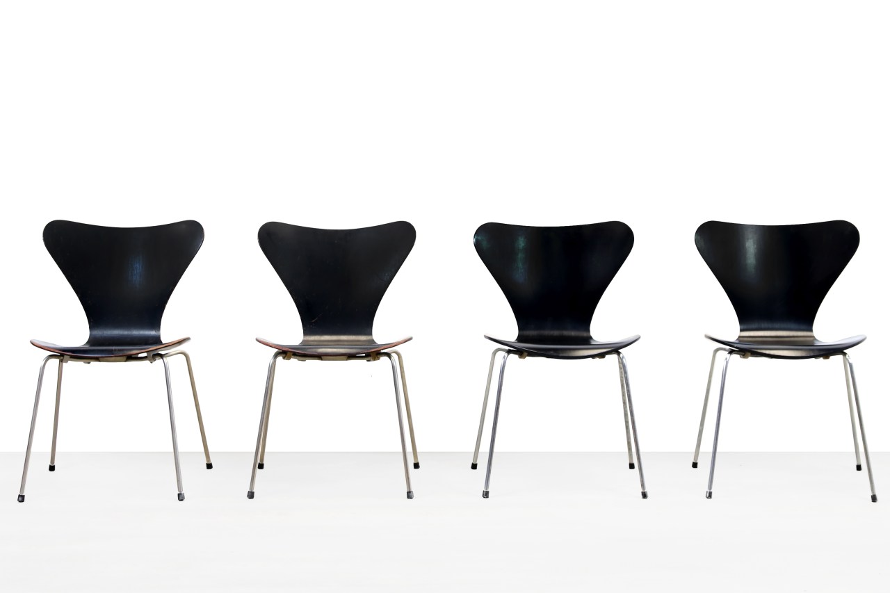 Omschrijving: Prachtige set van de meest bekende stoel van Arne Jacobsen, model 3107, oftewel de vlinderstoel. Het gaat hier om een set van 2 stoelen die zijn uitgebracht in de jaren 70. De originele plastic kappen aan de onderkant zijn aanwezig. De zittingen zijn recent opnieuw gespoten. De stoelen zijn 76 cm hoog, 46 cm breed en 44 cm diep. Wij hebben nog twee stoelen van Arne Jacobsen in zwart, waardoor ze samen een mooie set van vier kunnen vormen. Deze stoelen zijn ouder en hebben meer patina.