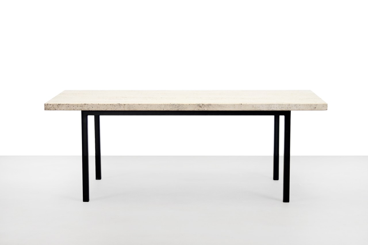 Omschrijving: Prachtige rechthoekige salontafel van Italiaans Travertijn. Mooie massief natuurstenen blad op een zwart gelakt minimalistisch metalen onderstel. Deze tafel is 119,5 cm breed, 50 cm diep en 44 cm hoog.