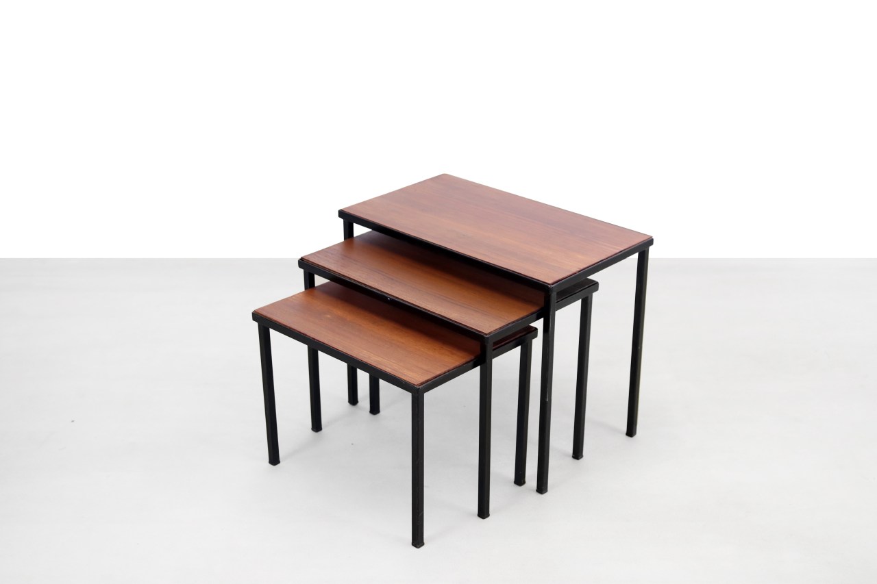 Omschrijving: Mooie ranke mimiset van zwart metaal met teakhouten bladen. Deze set is van de Nederlandse fabrikant Artimeta. Deze stijlvolle nesting tables zijn multifunctioneel en passen perfect in een modern interieur.