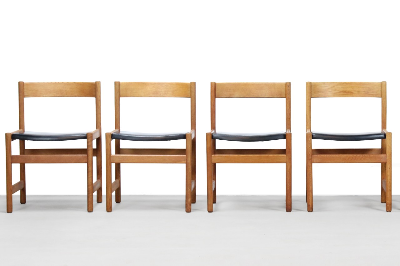 Omschrijving: Prachtige set van vier massief eiken eetkamerstoelen van de Triva serie, ontworpen door Yngvar Sandstrom uit Zweden in de tweede helft van de 20e eeuw. De zittingen zijn gestoffeerd in een zwart nep lederen bekleding, welke zeer goed schoon te houden is. Het houtwerk van de stoelen is grondig schoongemaakt en voorzien van een nieuwe laag olie. De stoelen hebben een prachtige simplistische shaker vormgeving, waarbij alle onnodige versieringen zijn weggelaten. De tafel welke ook op twee van de foto’s te zien is, is inmiddels verkocht. Evenals 4 stoelen, welke oorspronkelijk onderdeel waren van een set van 8. Wij bieden daarom nog vier stoelen te koop aan.