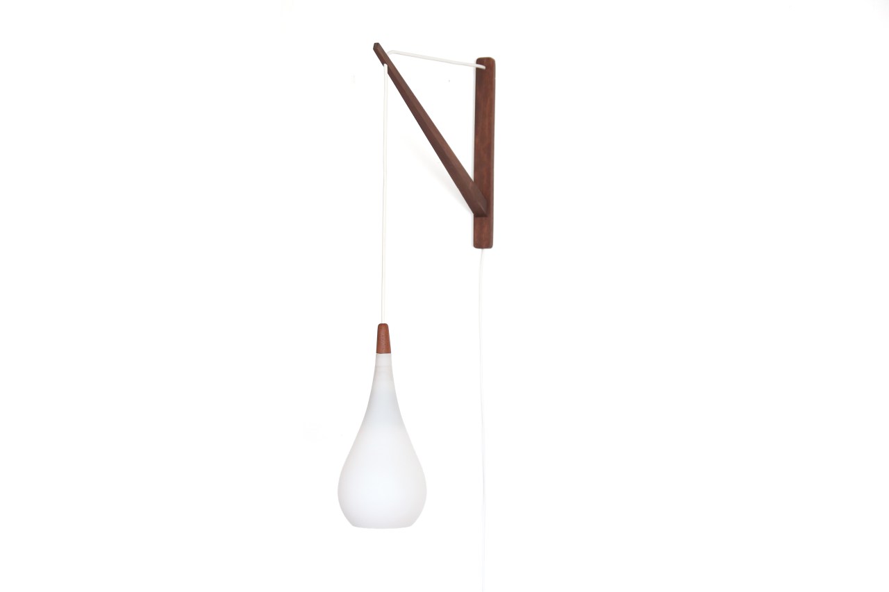 Omschrijving: Geweldige wandlamp van het Deense merk Holmegaard. De opaal wit glazen kelk in druppelvorm met teakhouten detail hangt aan een teakhouten ophanging. De lamp is gemerkt met ‘Made in Denmark’. Het melkwitte glas heeft een diameter van 16 cm en een hoogte van 29 cm. In totaal is de lamp 50 cm hoog. Deze lamp heeft een E27 fitting.