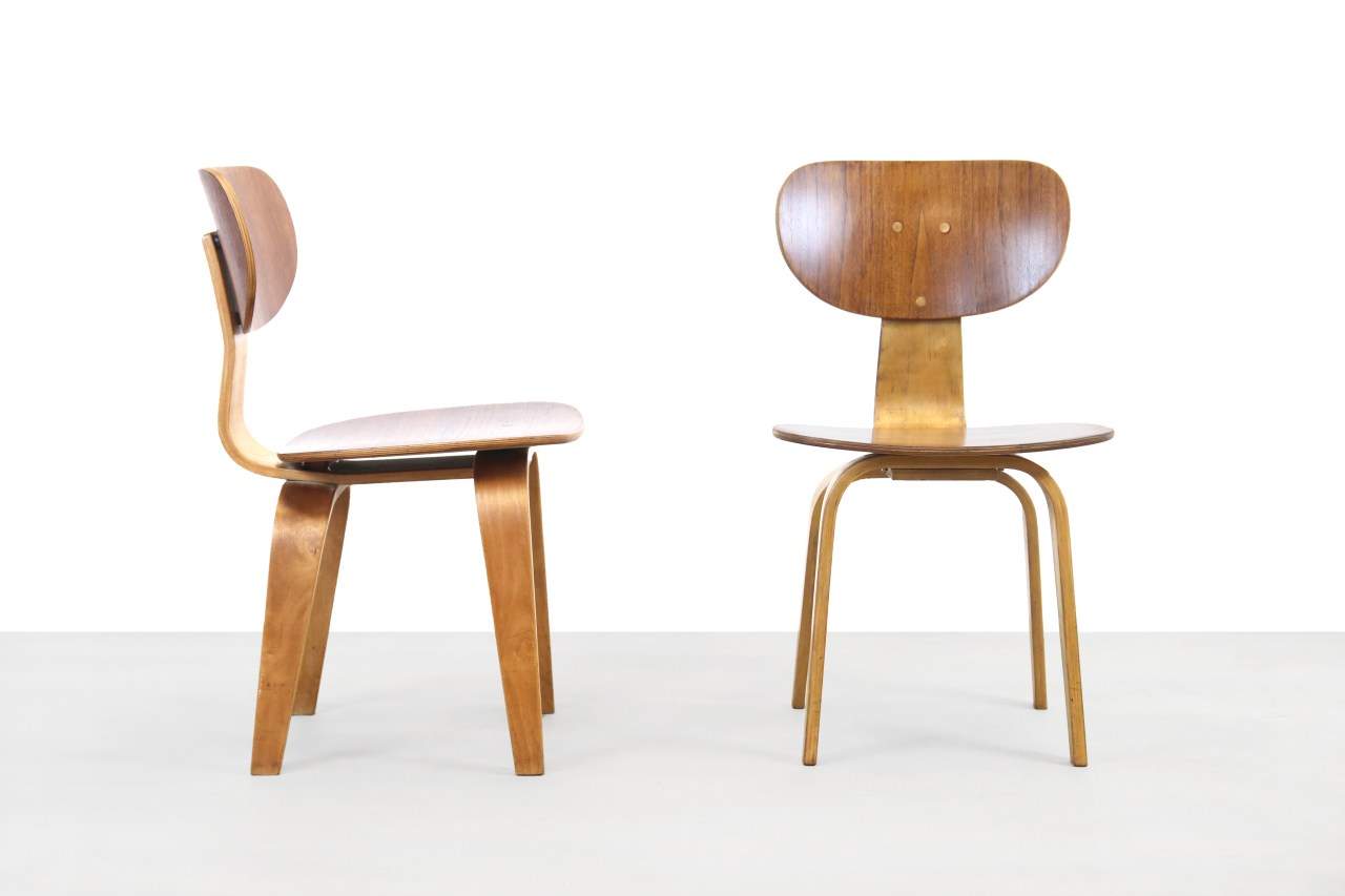 Omschrijving: Set van twee zeer mooie vintage stoelen van de bekende ontwerper Cees Braakman voor Pastoe. Na de Tweede Wereldoorlog bracht Braakman een bezoek aan de Verenigde Staten en leerde daar de plywood technieken bij Herman Miller. Deze stoel heeft modelnaam SB02 en is een combinatie van gebogen Berkenfineer plywood poten en teakhouten gefineerde zitting en rugleuning. De totale hoogte van een stoel is 81,5 cm en de zithoogte is 45 cm. De breedte is 46 cm en de diepte 49 cm.