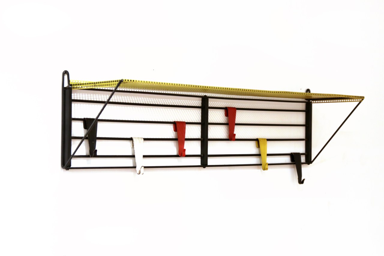 Omschrijving: Erg mooie Nederlands minimalistische kapstok ontworpen door Tjerk Reijenga voor Pilastro. Deze ‘notenbalk’ kapstok is een brede versie bestaande uit twee rijen. De kapstok heeft een geel geperforeerde metalen hoedenplank en 6 gekleurde haken die je op verschillende hoogtes op kan hangen. De kapstok is 24 cm hoog, 91 cm breed en 22 cm diep.