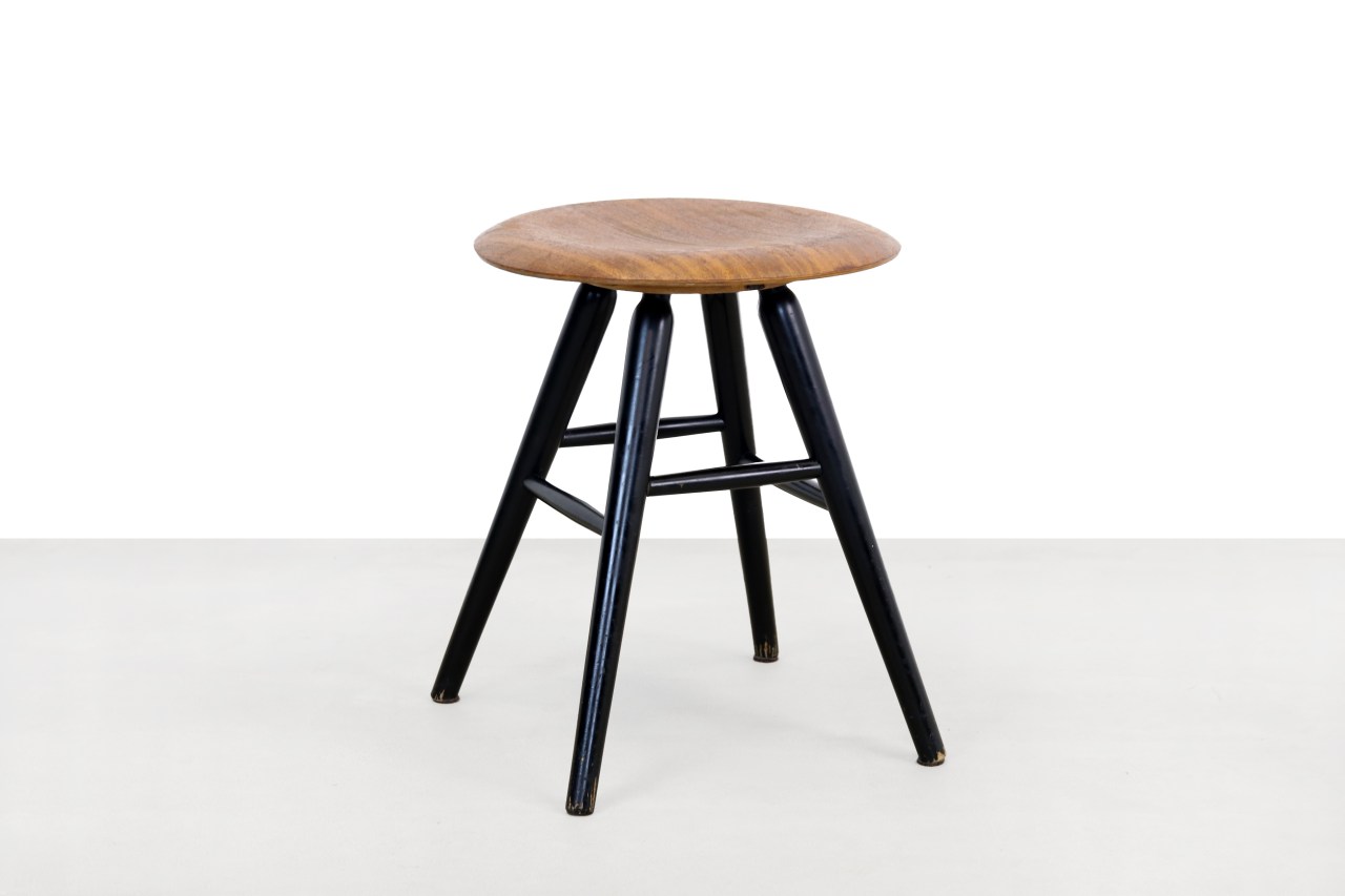 Omschrijving: Zeer mooie minimalistische stool ontworpen door Ilmari Tapiovaara en geproduceerd door Nesto. Deze kruk is Scandinavisch maar heeft een prachtige Japanse uitstraling. De ronde zitting is gemaakt van gebogen plywood teak fineer en de pootjes van zwart gelakt beuken. De kruk is 44 cm hoog, 47 cm breed en diep. De zitting heeft een diameter van 35 cm.