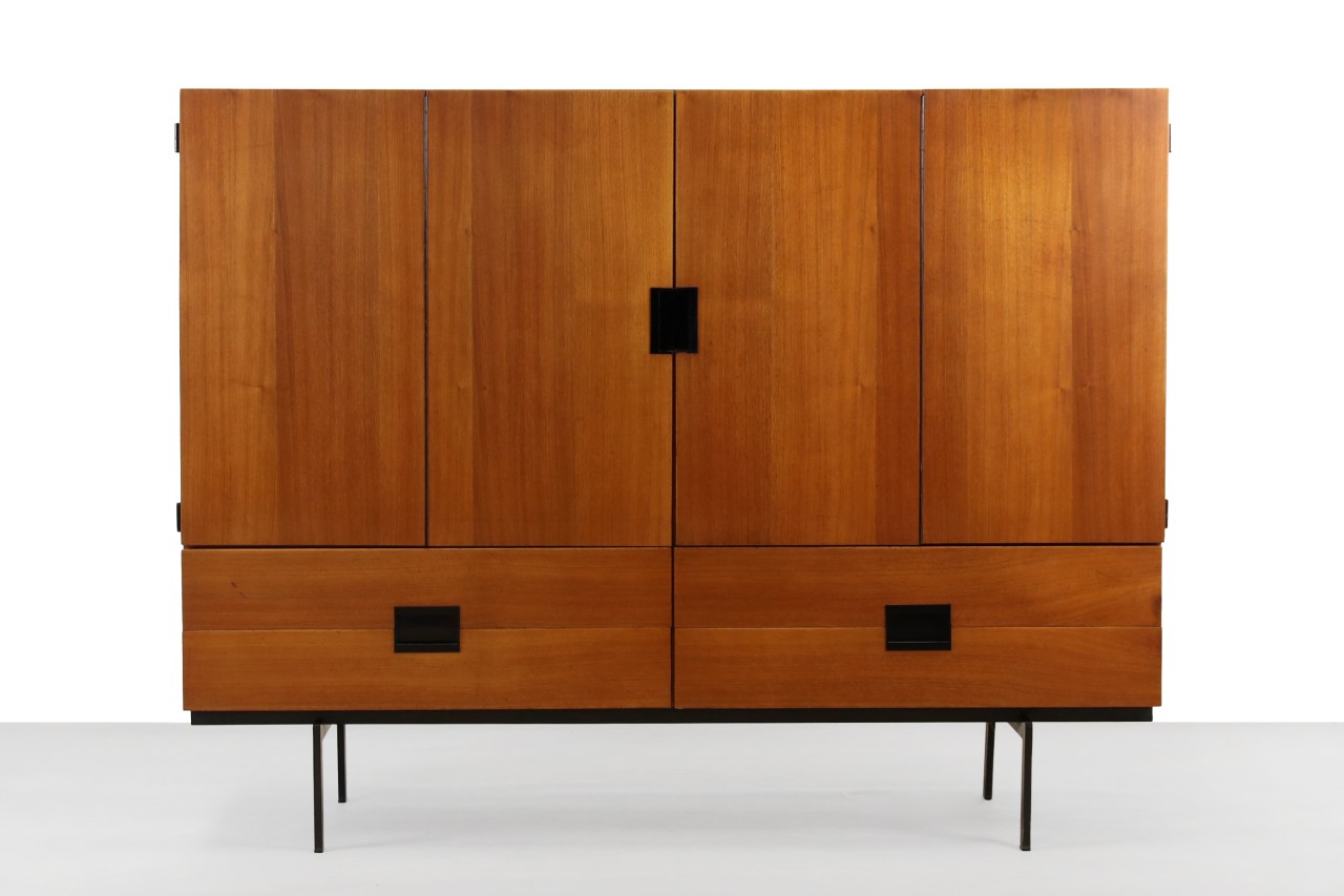 Omschrijving: Zeer mooi cabinet uit de Japanse Serie van Cees Braakman. Deze kast is niet alleen prachtig maar biedt ook veel opbergruimte. De teakhouten kast heeft een prachtige tekening en een gouden gloed in het hout, en de iconische zwarte handgreepjes. De kast staat op een slank minimalistisch metalen onderstel. De twee deuren aan de bovenkant, zijn eigenlijk vier harmonica vouwdeuren en onder deze deuren zijn vier anti-dust plywood lades te vinden. Dit highboard is 150 cm breed, 45 cm diep en 117 cm hoog.