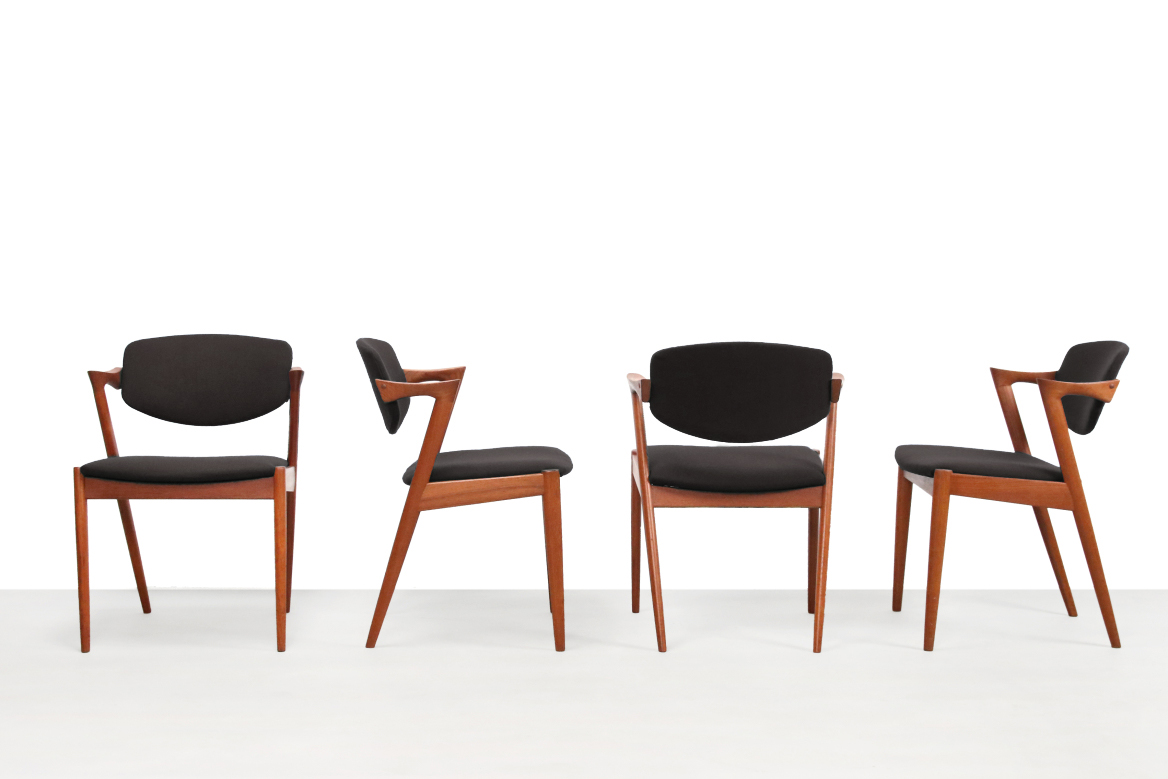 Deze set met donker blauwe bekleding is inmiddels verkocht, maar wij hebben nog 4 teak houten Model 42 eetkamerstoelen die nog opnieuw gestoffeerd moeten worden. Mocht u interesse hebben in deze set, kunnen wij de stoelen stofferen in de kleur van uw keuze.