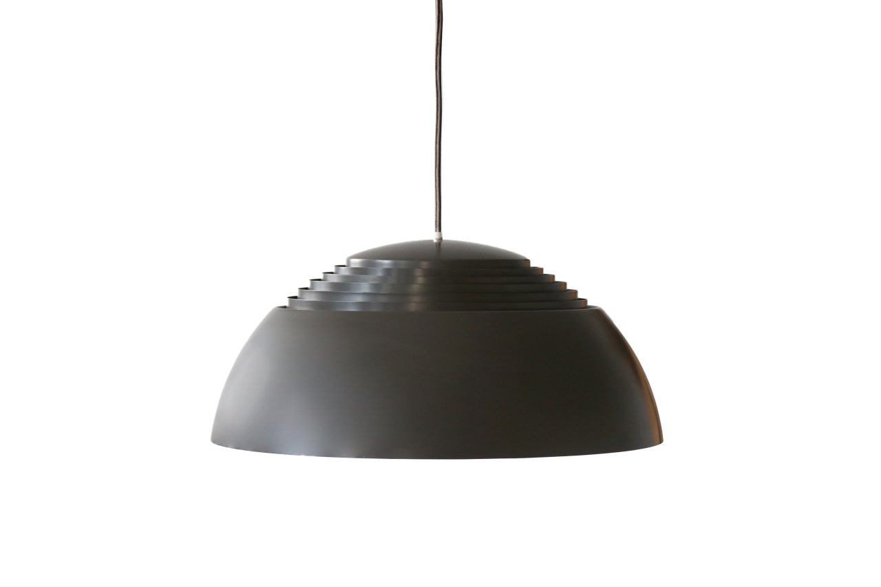 Omschrijving: Deze AJ Royal lamp is ontworpen door Arne Jacobsen voor Louis Poulsen in de jaren 70. Bijzonder aan deze lamp is de kleur. Door deze groen bruine kleur en de manier waarop de lamellen van de lamp bevestigd zijn, kunnen wij zien dat deze lamp uit het begin van de jaren 70 komt. Fijn aan deze lamp is dat hij zowel licht naar boven als naar beneden schijnen door het ontwerp van de lamp waarbij gebruik is gemaakt van 4 E27 fittingen. Een perfecte lamp om een grotere ruimte mee te verlichten. Afmetingen van deze Deense design klassieker is 50 cm in diameter en 23 cm hoog.