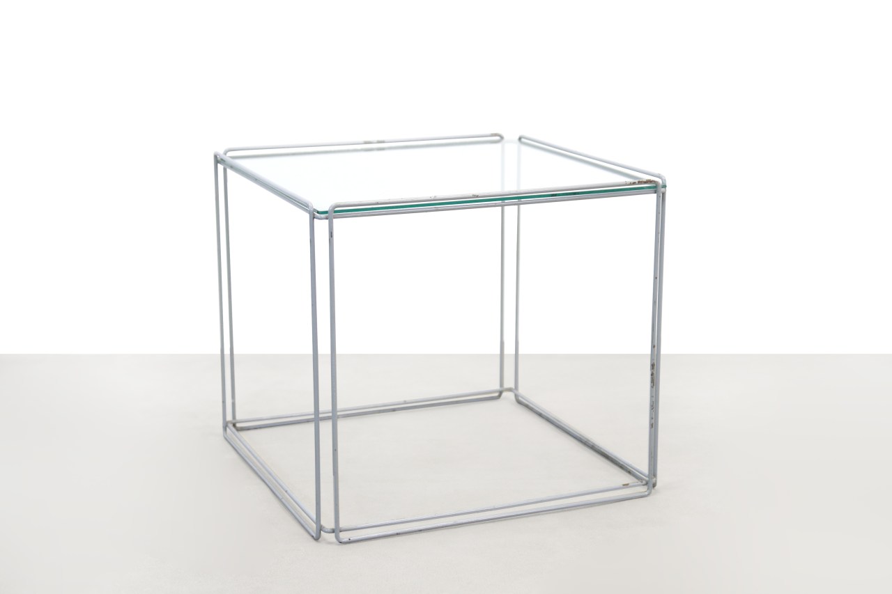 Omschrijving: Mooie bijzettafel ontworpen door Max Sauze en gemaakt van grijs draadstaal en een glazen blad. Het glazen blad ligt los op het frame wat de lijnen strak en simpel houdt. Vooral het kubistische lijnenspel is echt prachtig aan deze tafel. Prachtig multifunctioneel bijzettafeltje van 45 bij 45 cm en 40 cm hoog.