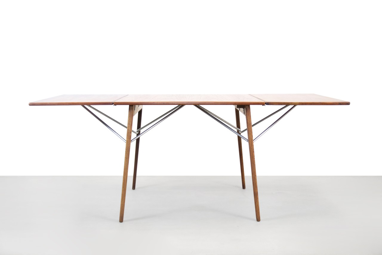 Omschrijving: Zeer bijzondere en zeldzame drop leaf eetkamertafel ontworpen door Borge Mogensen uit Denemarken. Deze tafel is gemaakt van teak gefineerde tafelbladen op een massief eiken houten onderstel. Prachtig lijnenspel veroorzaakt door de metalen stangen die de extra bladen omhoog houden, maar welke ook eenvoudig weg geklikt kunnen worden door een handig mechanisme onder het tafelblad. Deze tafel draagt modelnaam 162. Deze tafel is 73 cm hoog en 90 bij 90 cm. Per elk extra blad komt er 50 cm bij.