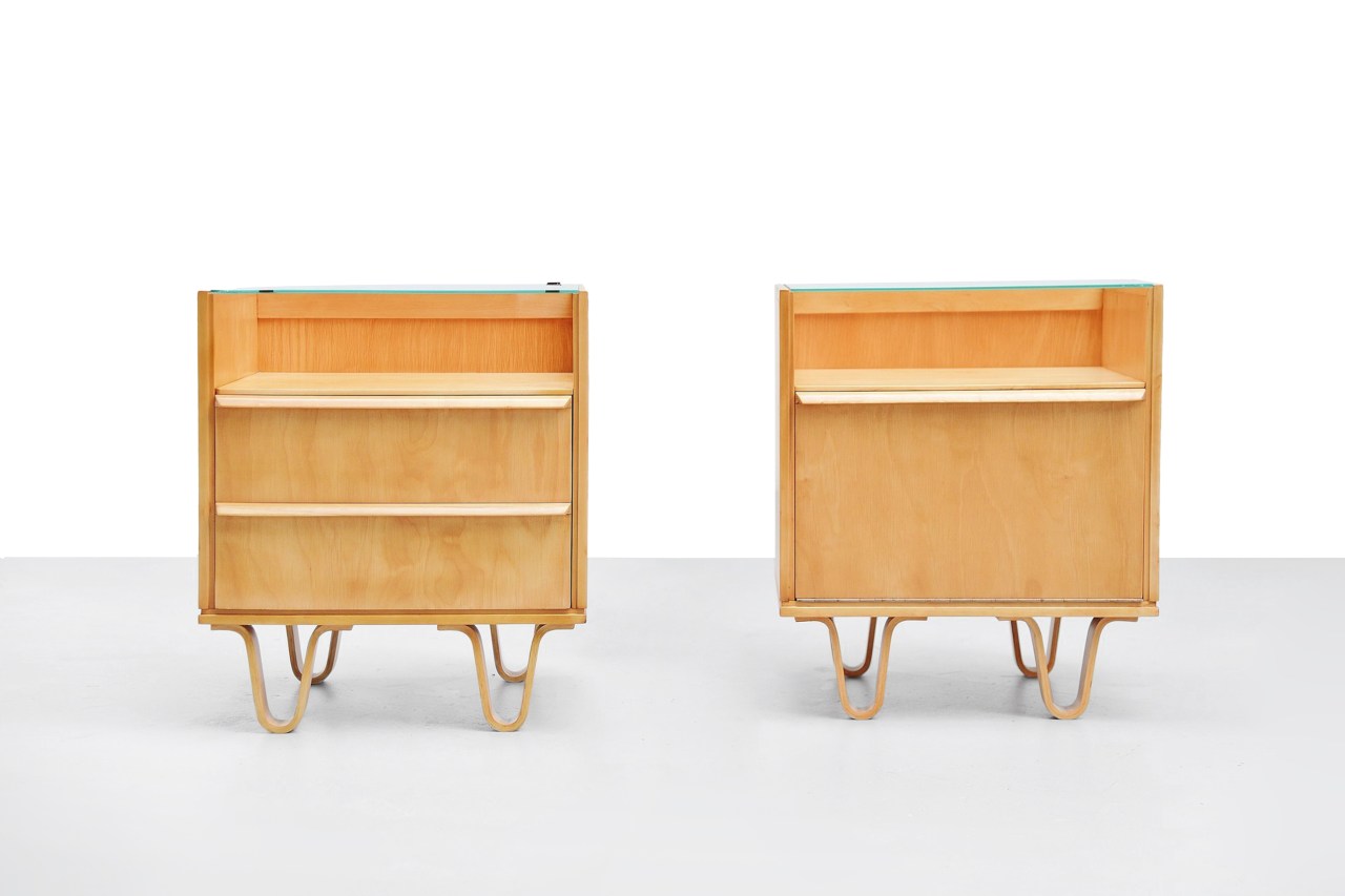 Omschrijving: Prachtige complete set van twee berkenhouten nachtkastjes ontworpen door Cees Braakman voor Pastoe. Deze nachtkastjes komen uit de welbekende berkenserie en zijn in het bezit van de originele glasplaatjes en zijn beiden nog in uitzonderlijk goede staat. De kastjes zijn 50 cm breed, 57 cm hoog en 38 cm diep.