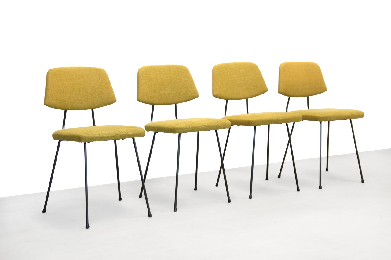 Omschrijving: Geweldige set van vier eetkamer stoelen van Rudolf Wolf voor Elsrijk. Het frame is van zwart gelakt metaal en de stoelen zijn bekleed met een warm gele gemêleerde meubelstof van Leolux. De totale hoogte van de stoelen is 79cm, de zithoogte is 45 cm, breedte 40 cm en 40 cm diepte.