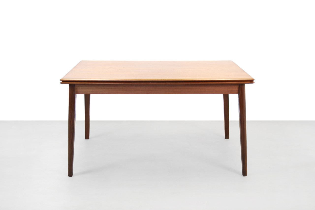 Omschrijving: Vintage Deense uitschuifbare eetkamertafel uitgevoerd in teakhout. De extra bladen zijn mooi geïntegreerd in het ontwerp opgeborgen onder het blad. De tafelbladen zijn afgewerkt met massief teak houten randen, waardoor de randjes nog in mooie staat zijn.