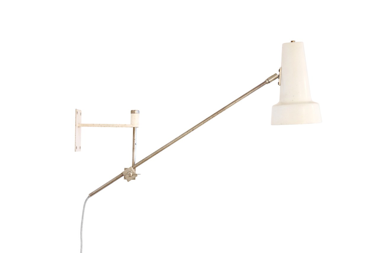 Omschrijving: Bijzondere Nederlands modernistische design wandlamp uit het begin van de jaren 60. Deze verstelbare witte hengellamp is ontworpen door Willem Hagoort voor Hagoort lampen Rotterdam. Het chroom van de stang is in de loop der tijd wat gaan oxideren, zie foto, maar verder is de lamp nog in erg nette staat. De bedrading is vervangen, waardoor er weer veilig gebruik gemaakt kan worden van de lamp. Deze wandlamp is 62 cm in lengte en de kap heeft een diameter van 14 cm.