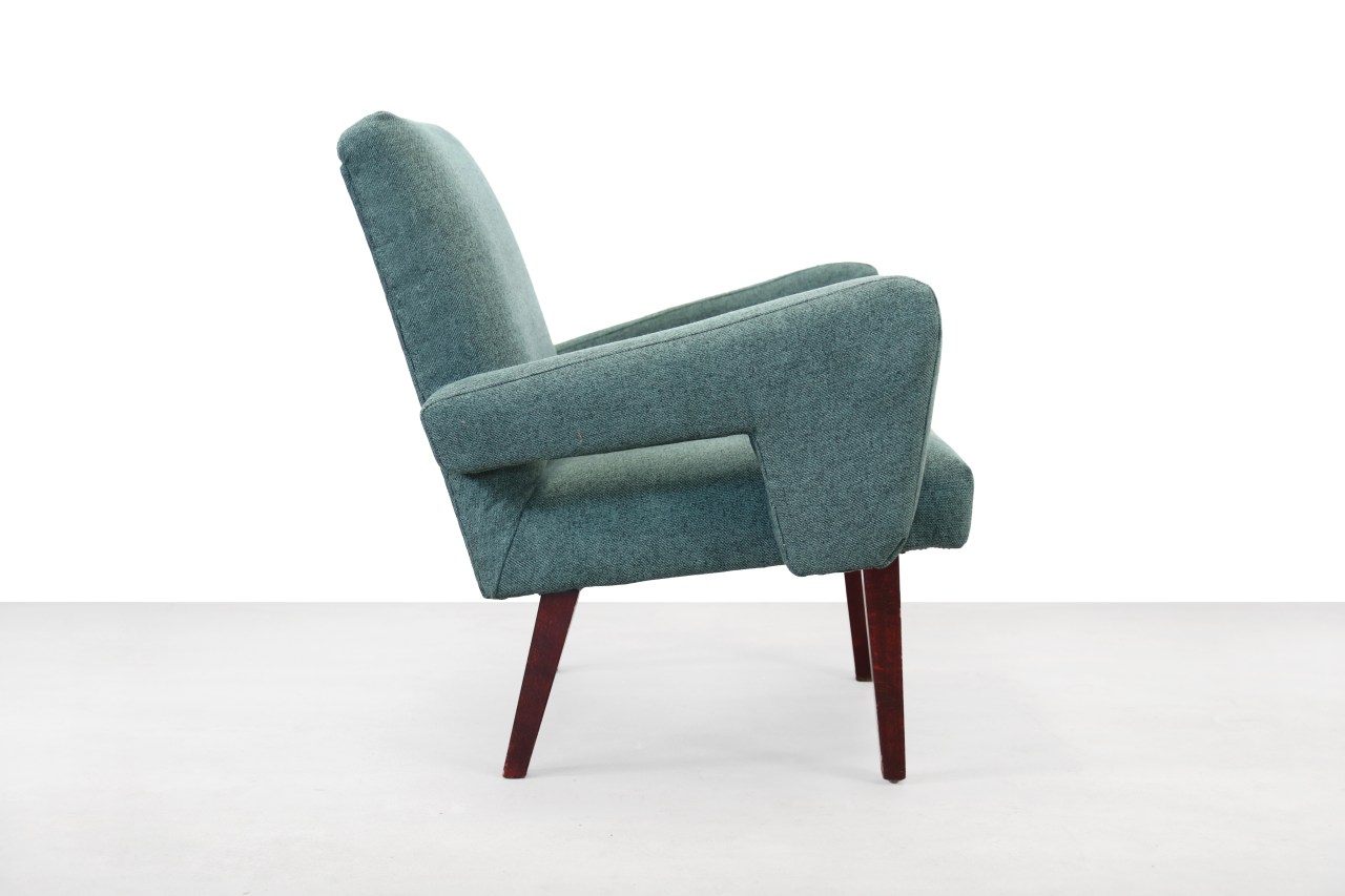 Omschrijving: Leuke set arm chairs van Jitona uit Tsjechië gestoffeerd in een groene gemêleerde meubelstof. De ontwerpen uit Tsjechië uit de jaren 60 zijn bij ons in het westen van Europa nog niet zo bekend. Onterecht als je het ons vraagt. Deze fauteuils zijn een mooi voorbeeld van de strakke lijnen van het Mid Century Modern design uit de jaren 60 van Oost Europa. Waarbij de uitgesproken armleuningen toch wel echt de eyecatcher van de stoel zijn. De fauteuils zijn opnieuw gestoffeerd. De lounge stoelen worden bij voorkeur als complete set verkocht.
