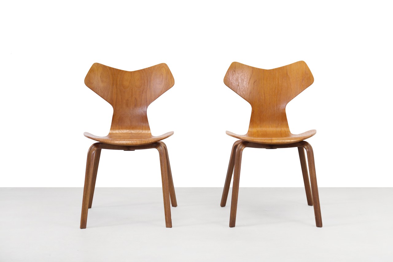 Omschrijving: Twee vintage teakhouten Grand Prix stoelen van Arne Jacobsen. Deze stoelen werden ontworpen als ‘stoel 4130’ maar kreeg al snel de naam ‘Grand Prix’ omdat deze stoel de grote prijs won op het Triënnale in Milaan. Deze prachtige vintage design stoelen hebben een totale hoogte van 73 cm, een zithoogte van 44 cm, een breedte van 45 cm en een diepte van 41 cm.