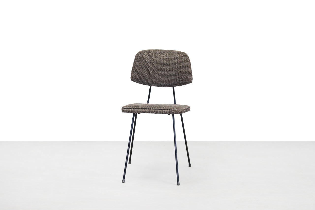 Omschrijving: Geweldig staaltje Dutch design eetkamerstoel van Rudolf Wolf voor Elsrijk. Het frame is van zwart gelakt metaal en de stoel heeft de originele grove wollen bekleding. De kleur is bruin zwart gemêleerd. De totale hoogte van de stoel is 79 cm, de zithoogte is 45,5cm, breedte 40 cm en 40 cm diepte.