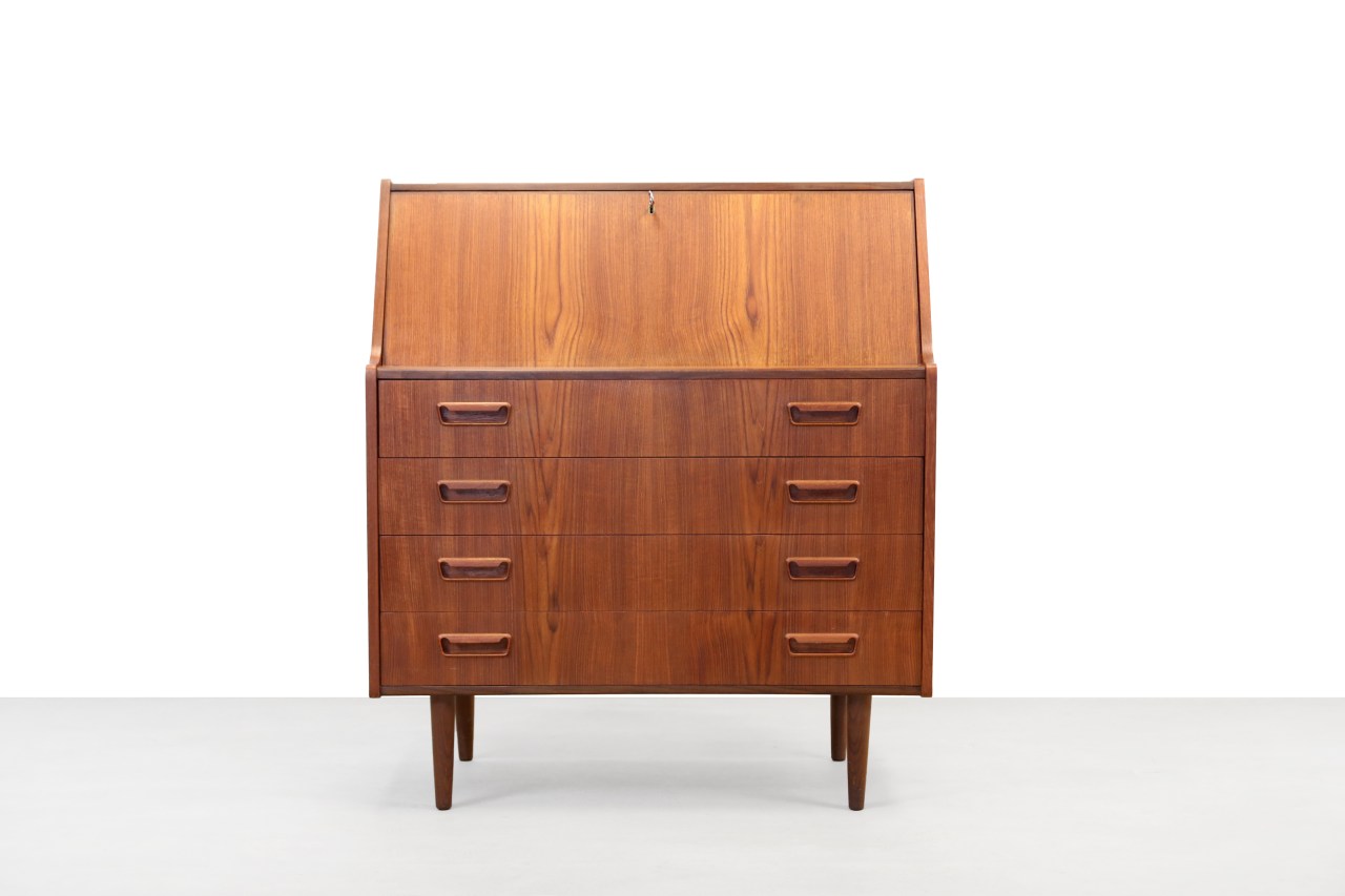 Omschrijving: Prachtige secretaire ontworpen door Gunnar Nielsen Tibergaard en geproduceerd door Tibergaard Denmark in de jaren 60 in Denemarken. De klep van het secretaire is tevens het bureaublad als deze open is geklapt. Achter dit bureaublad zijn verschillende opbergvakken en lades te vinden. Onder het werkblad zijn nog vier lades te vinden met prachtig vormgegeven greepjes.