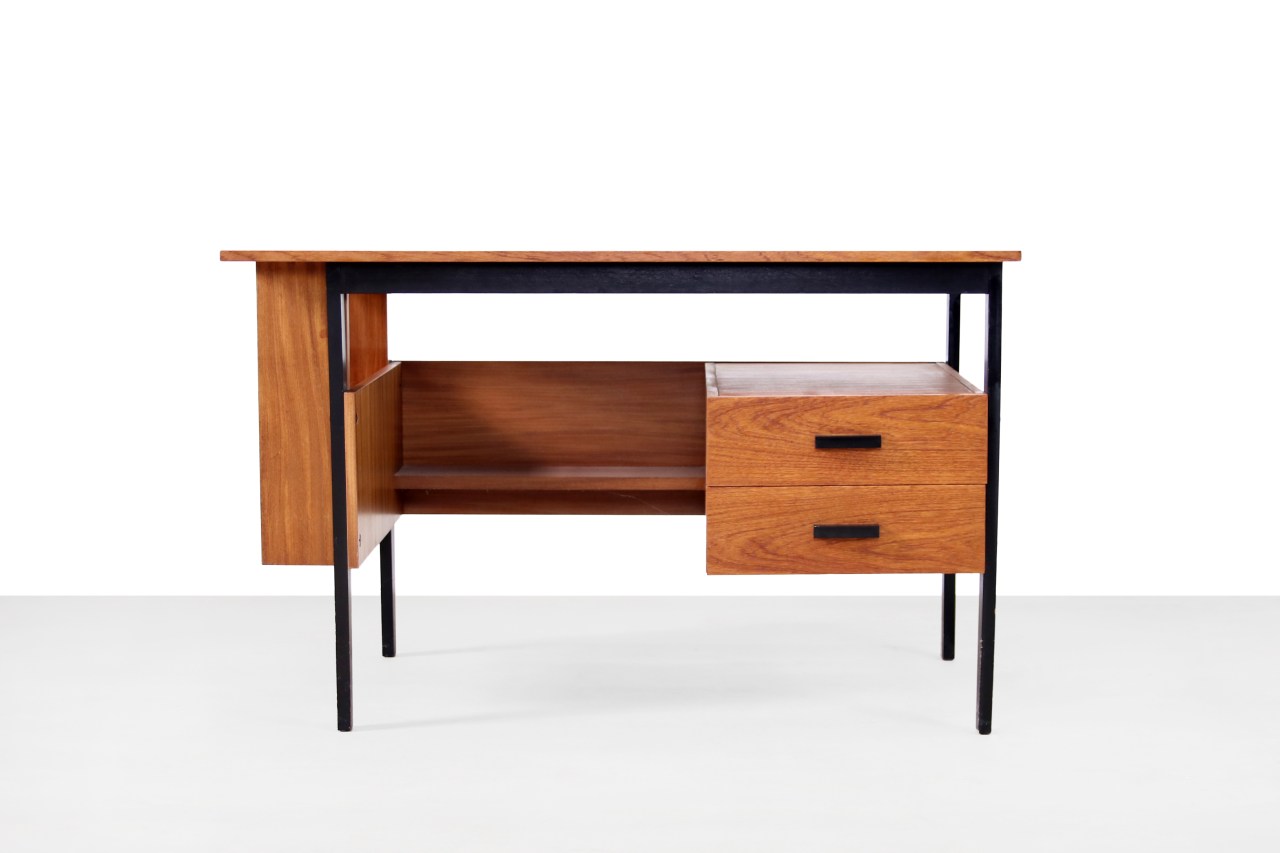 Omschrijving: Minimalistisch en stijlvol Nederlands design bureau in teak hout met zwart gelakte pootjes. Dit slimme bureau heeft aan de rechterzijde een ladeblok met 2 lades en aan de linkerzijde een open vak op de kopse kant voor bijvoorbeeld je boeken of mappen. Het bureau is zo ontworpen dat hij ook vrij in de ruimte kan staan en niet alleen tegen de muur. De afmeting is: 74 cm hoog, 130 cm breed bij 60 cm diep.