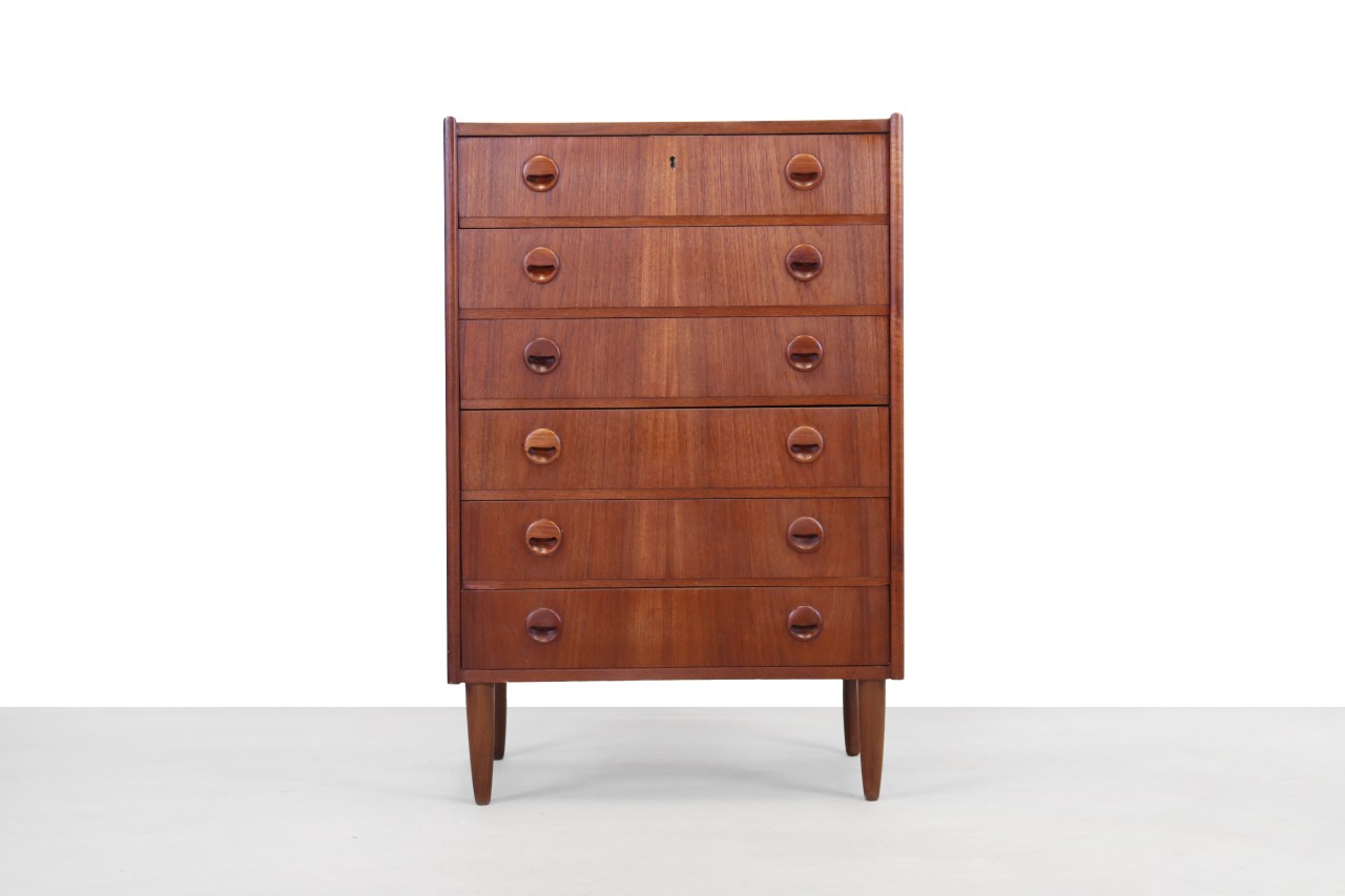 Omschrijving: Deens design ladekast met 6 lades. Uitgevoerd in teak hout met prachtige ronde greepjes. Deze ladenkast komt uit de jaren 60 uit Denemarken. Gebruik deze kast voor in de gang, voor in de slaapkamer voor je sokken en je ondergoed, of eventueel als commode. Deze kast is 105 cm hoog, 42 cm diep en 69 cm breed.