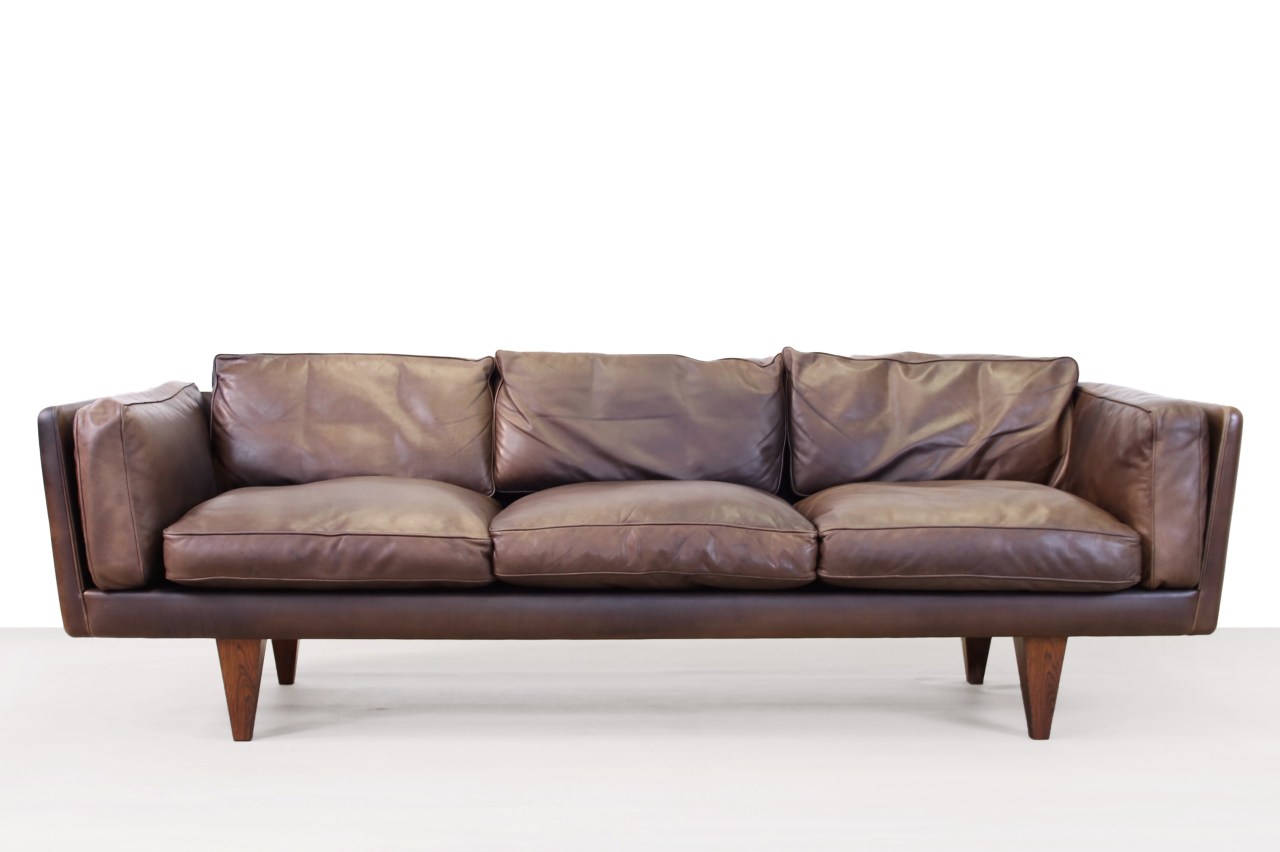 Omschrijving: Zeldzame vrijstaande bruin leren V11 driepersoons bank ontworpen door Illum Wikkelsø voor Holger Christiansen in Denemarken. Deze super comfortabele bank is gemaakt van hoogwaardig donker bruin leer welke erg soepel en zacht aanvoelt en staat op prachtige toelopende Palissander houten pootjes. De kussens zijn gevuld met dons. De bank is van hoge kwaliteit en is zeer mooi afgewerkt. Deze sofa verdiend een mooie plek midden in de ruimte. De bank is 230 cm lang, 80 cm diep en heeft een zithoogte van 40 cm.