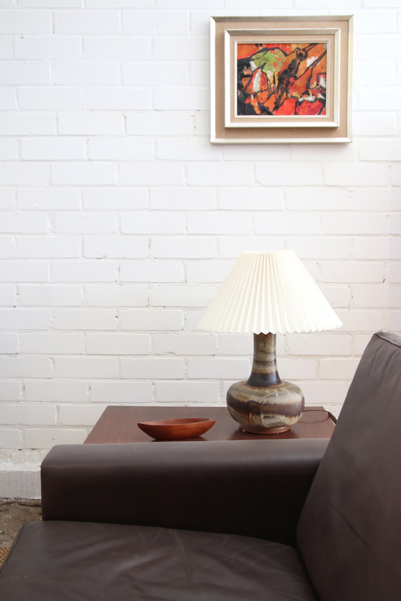 Omschrijving: Mooie lamp van Jette Hellerøe voor Axella Stentøj uit Denemarken. Gemaakt van geglazuurd keramiek en een Le Klint stijl kap.