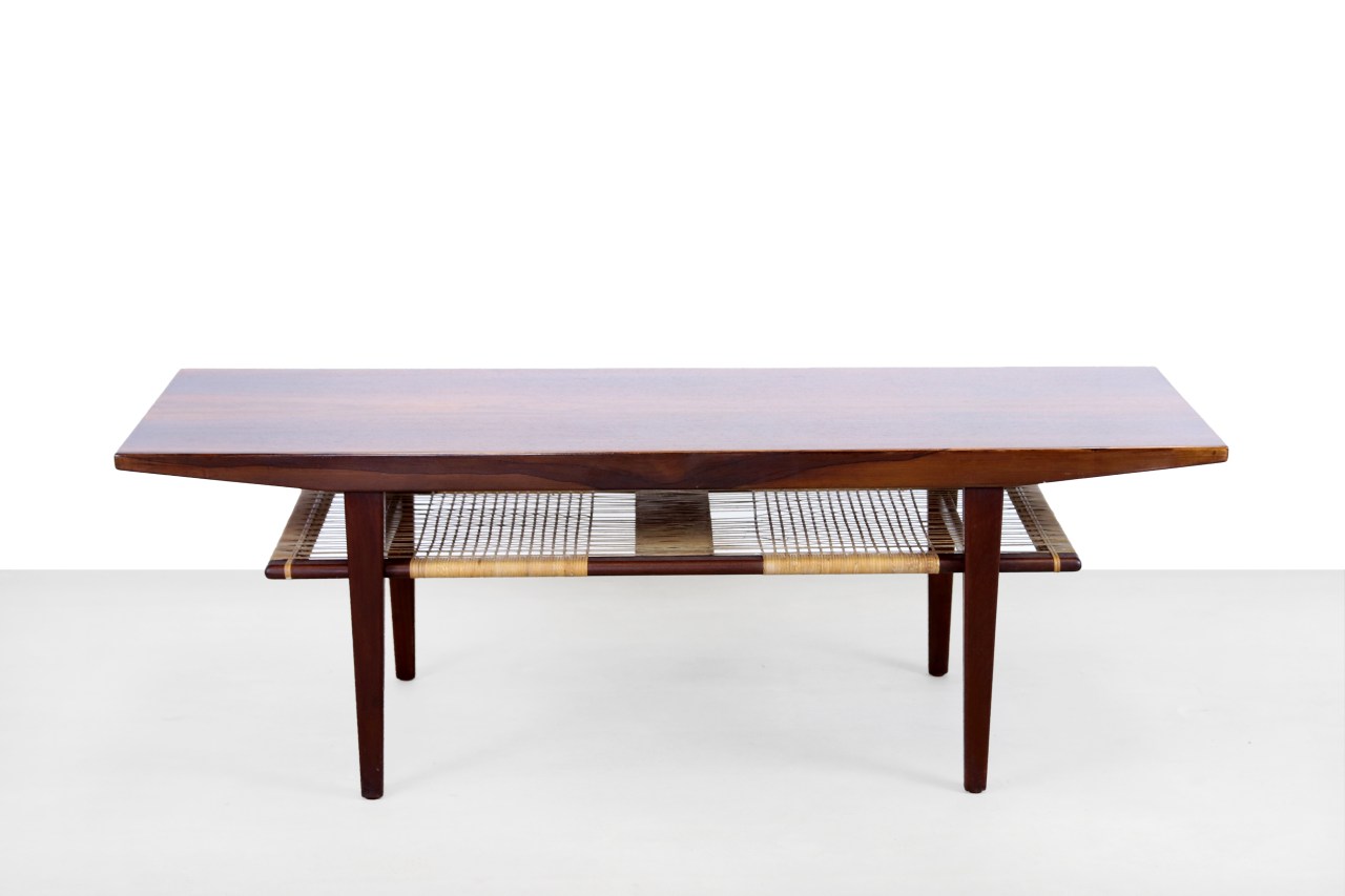 Omschrijving: Prachtige vintage salontafel uit Denemarken. Gemaakt van palissander fineer en massief palissanderhout. Deze coffee table heeft een legplank van riet voor magazines. De afmeting is 150 cm lang, 50 cm diep en heeft een hoogte van 51 cm.