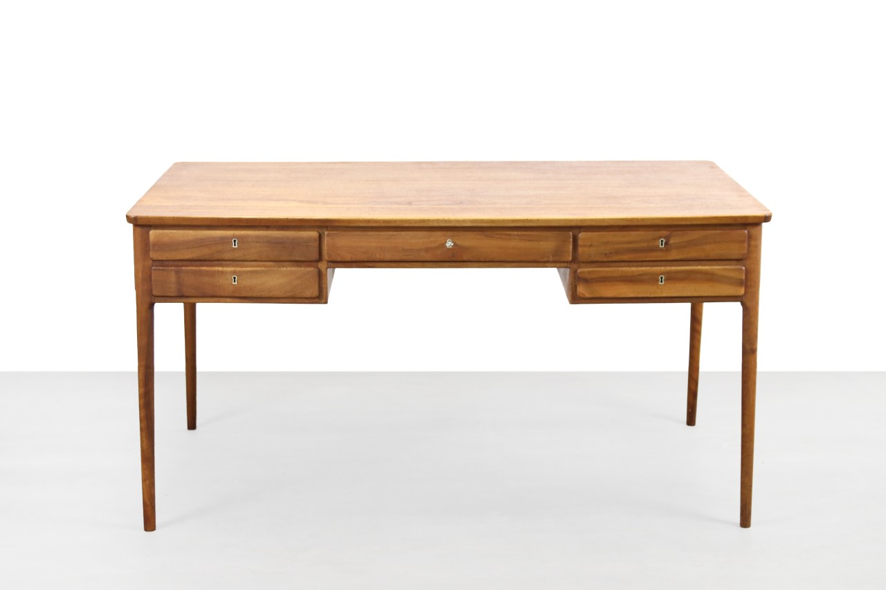Omschrijving: Bijzonder mooi bureau uit Denemarken die sterk doet denken aan de ontwerpen van Ole Wanscher. Gemaakt in Notenhout en Notenfiner. Het minimalistische design, de mooie tekening in het hout en de prachtige details maken dit bureau een plaatje om te zien. Het bureau beschikt over 5 lades met 1 sleutel. Het bureau is 139 cm breed, 75 cm diep en heeft een hoogte van 72 cm.