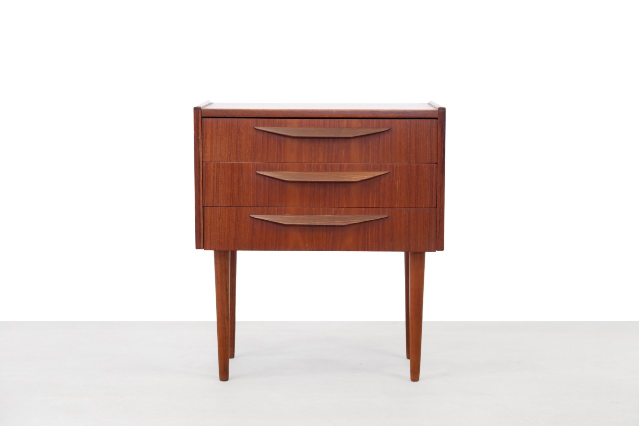 Omschrijving: Prachtige teak houten ladenkast uit Denemarken. Gemaakt van teak fineer en massief teak details met een mooie tekening in het hout. Dit kastje heeft 3 lades en is te gebruiken op meerdere plekken in het huis. Gebruik het kastje als bijzettafel met opbergmogelijkheid, als gangkastje of bijvoorbeeld als nachtkastje. Dit kastje heeft een afmeting van 54 cm breed, 31 cm diep en 60.5 cm hoog.