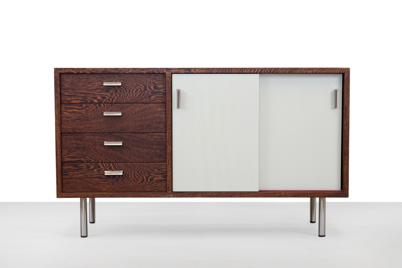 Omschrijving: Zeer stijlvol modernistisch wengé houten dressoir. Gemaakt van wengé fineer, licht grijs gelakte deurtjes en aluminium details. De kast heeft vier lades en twee schuifdeuren en bied veel opbergruimte, maar is toch compact. Het dressoir is 126 cm breed, 45 cm diep en 75 cm hoog.
